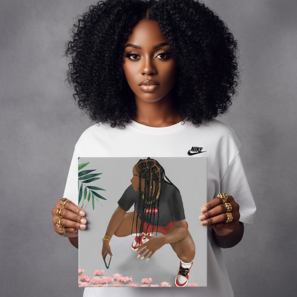 TOMY BOY Canvas celebrates bold individuals who own their style and confidence. With sharp details like braided hair, polished nails, and classic sneakers, this piece represents freedom beyond gender—combining street edge with sweetness. It's a tribute to those who lead, not follow, showing strength and self-assurance in every pose.