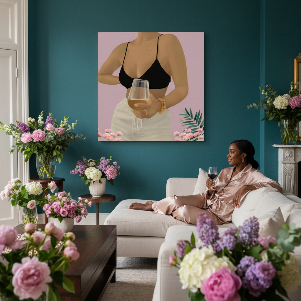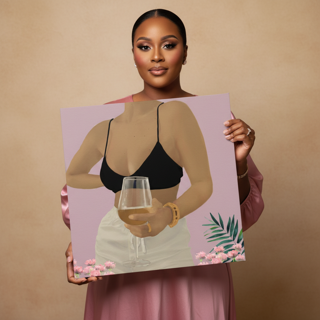 Unwine Canvas Luxury in Stillness beautifully celebrates Black femininity with warmth and elegance. This exclusive canvas showcases a poised muse holding a glass of white wine against a soft blush background. Its vivid, fade-resistant print adds texture and sophistication, making it perfect for elevating any room or office with refined style and confidence.