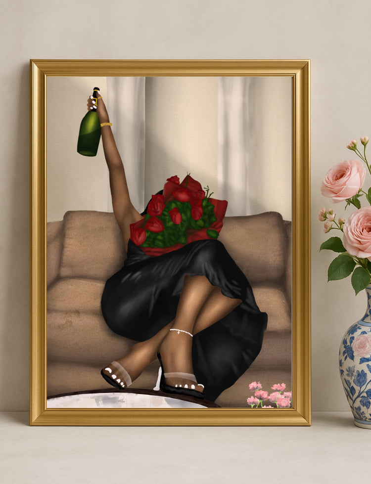 This piece radiates the quiet, powerful emotion of arrival. It speaks to what it feels like to overcome—when the weight you carried for so long is finally off your shoulders, and you can just be. Legs crossed, glass raised, roses in full bloom—it’s the embodiment of choosing joy after struggle, of living in the softness you once had to fight for.